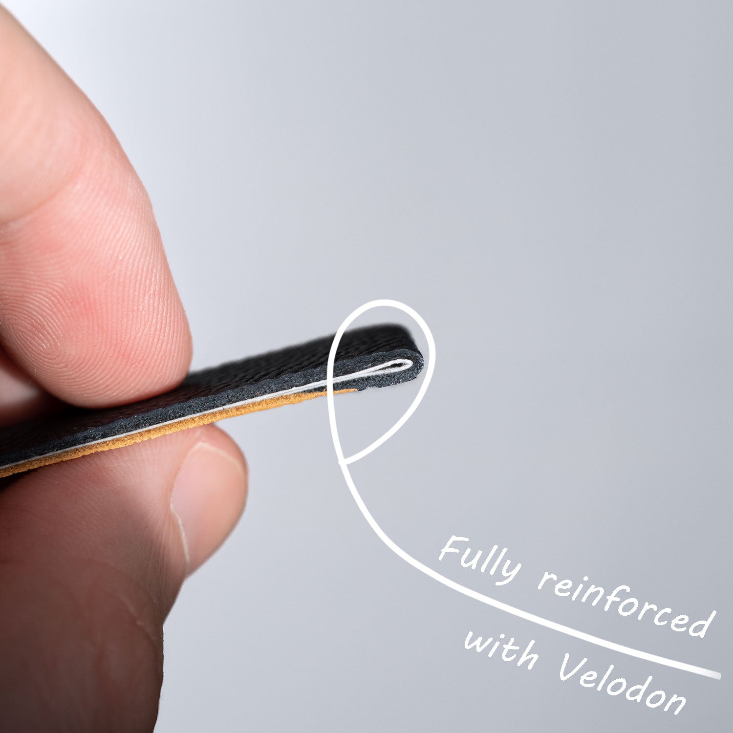 Our straps are fully reinforced with Velodon - an ultra-durable, anti-stretch material just 0.2 mm thick. It runs through the entire length of the strap, including the loops at the lug and buckle ends.