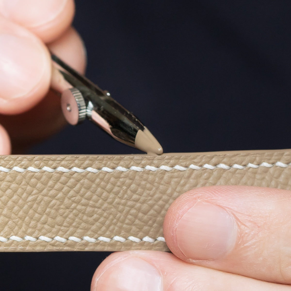 Every edge of the strap is carefully hand-painted, layer by layer (a base coat typically followed by four layers of paint), with sanding between each layer for a smooth, seamless finish. This meticulous process gives the strap its durability, while creating a polished edge that highlights the leather’s natural beauty and reflects true craftsmanship.