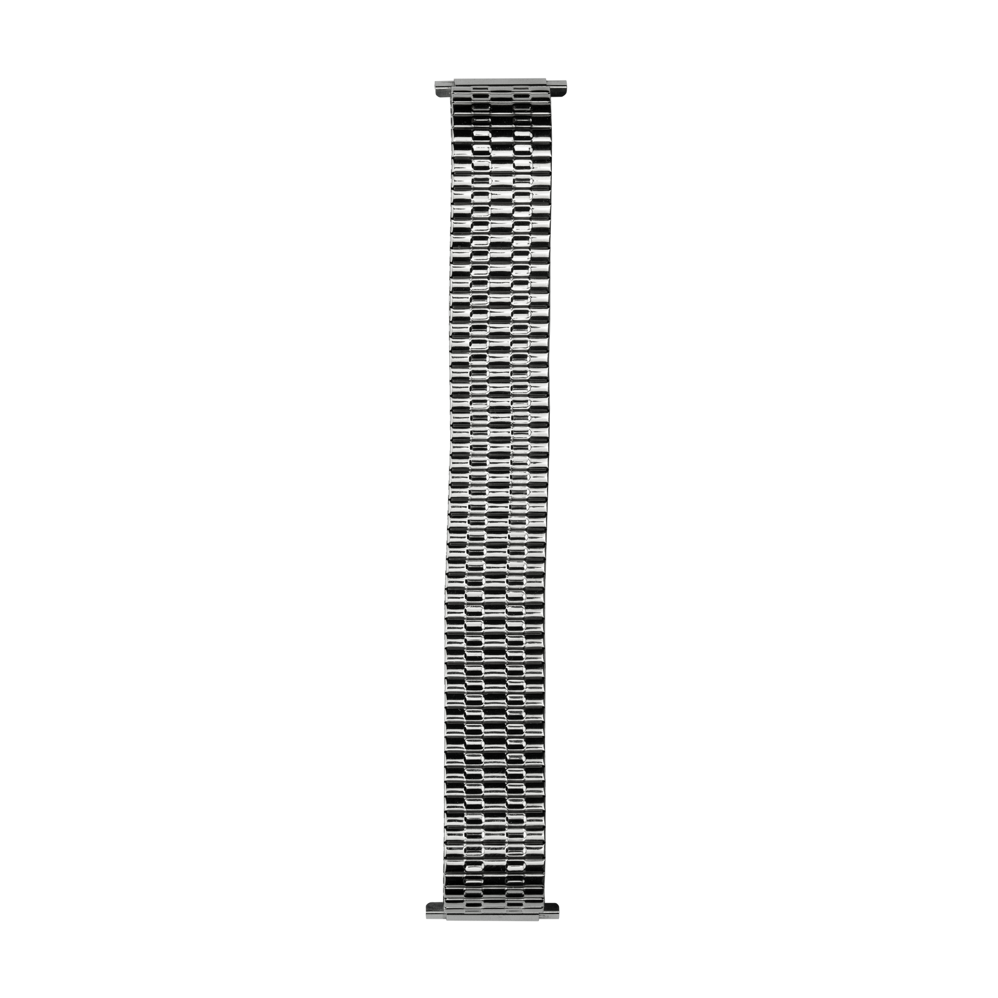 This metal watch strap features spring-loaded end pieces, allowing it to fit lug widths between 16mm and 22mm. The strap itself is 20mm wide. It does not use a traditional buckle – instead, its stretchable link design provides a secure and comfortable fit. Please note that adjusting the size at home without precise tools can be challenging. We recommend visiting a watch shop for proper resizing.